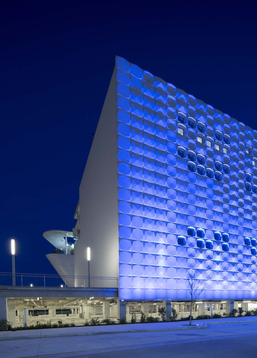 Hill’s management contributions involved navigating the complex logistics for building the curved, compound-radius building skin, which acts as a rain-screen and is covered in 40,000 SF of 3 inch mosaic tiles. This highly aesthetic “fish scale” exterior of the Living Core Building was designed and constructed to sustain a Category 5 hurricane. The project team used a combination of laser scanning and 3D modeling to verify the exterior’s many components fit precisely and provided the required level of protection. The tiles were installed with precise quarter-inch spacing. None were cut-to-fit, and this installation reportedly comprises the largest exterior mosaic wall of its kind.