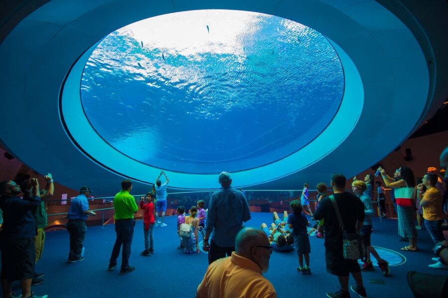 For the museum’s Gulf Stream Aquarium, Hill managed logistics for building the world’s largest conical concrete tank. The cast-in-place, post-tensioned, reinforced tank was poured with hydrophobic concrete in a continuous 25-hour process distributing 1,200 CY of concrete and involving 131 cement trucks and two teams of 150 people each. The angle of the vessel’s sides—as steep as 44 degrees—caused normal concrete to slide, so engineers created a mixture thick enough to stay put yet loose enough to envelop a checkerboard of rebar, requiring numerous trial runs to find the perfect viscosity and hold. The concrete also needed to be properly vibrated, even at steep angles, to settle and bond fully. During practices, workers customized their gear to vibrate at proper angles without cutting into the surface—an industry first.